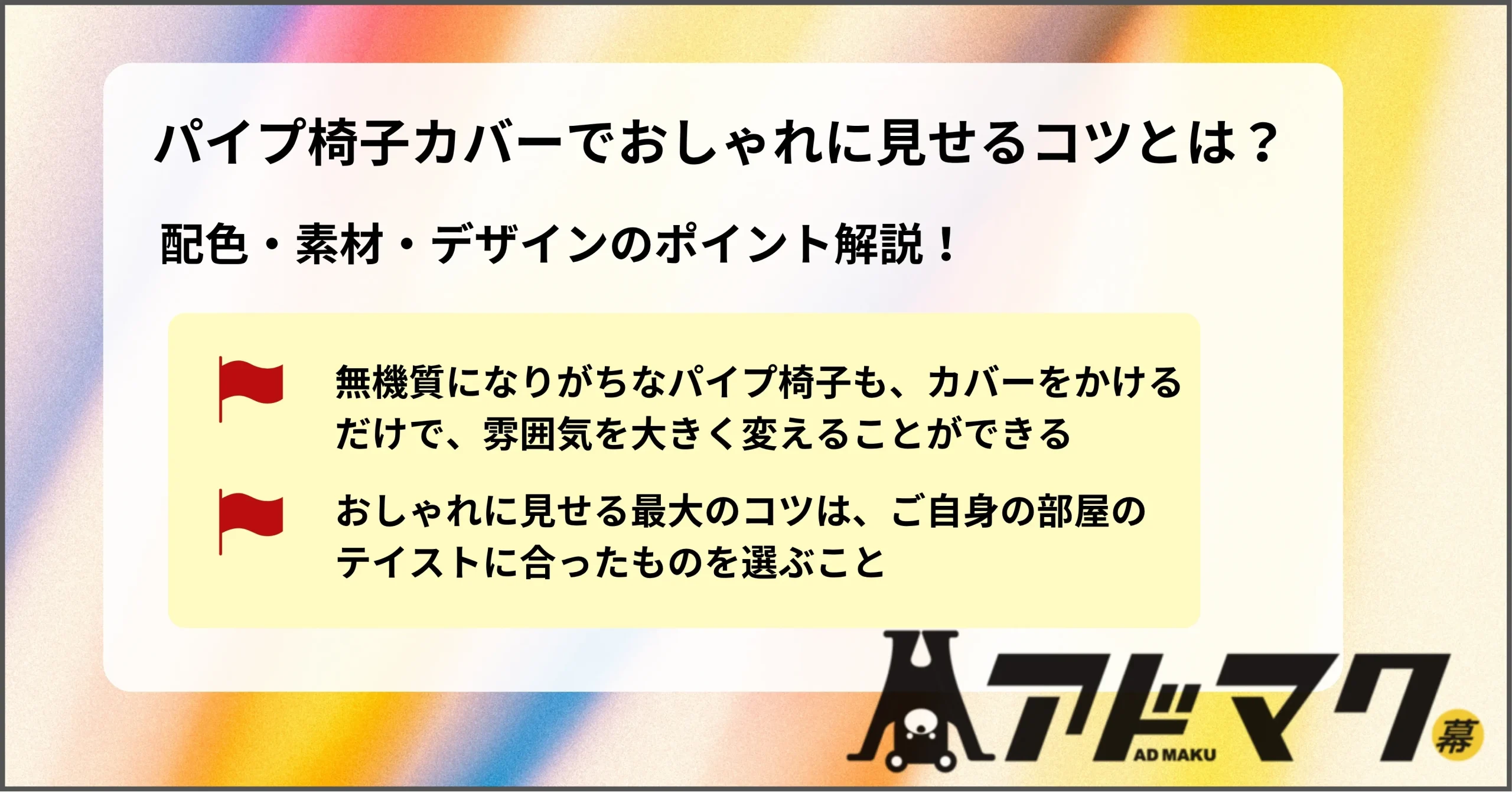 看板制作サービス「アドマク」などでは、会社のロゴやイベント名、好きなデザインを印刷したオーダーメイドのパイプ椅子カバーを注文できます。