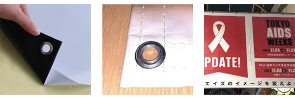 何個でも無料で対応致します。また、数や位置の指定が無い場合は50cm~70cmピッチでハトメを付けます。