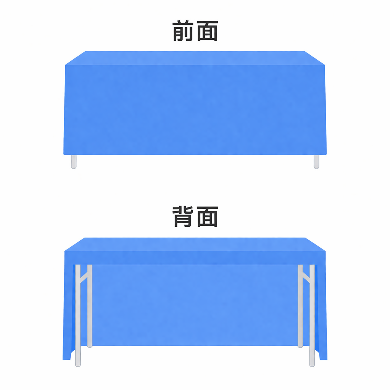 下記の2タイプのテーブルに合うサイズとなります。 ①幅1800×高さ700×奥行600mm用 ②幅1800×高さ700×奥行450mm用 当社のBOXタイプは背面側が空いたタイプとなります。 テーブルの下に物を収納できるため使い勝手がよく、展示会などでも多く使用されています。 背面を完全に覆うタイプをご希望の方は別途お問合せください。