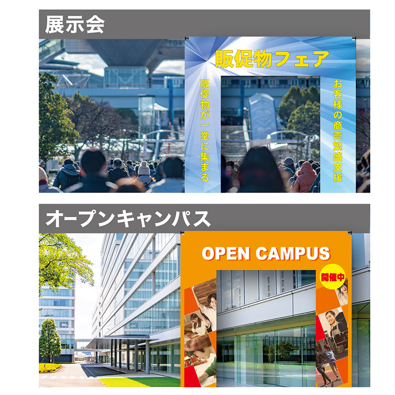 展示会やオープンキャンパス等のイベント時、出入口に設置することで遠くからでも一目でわかる目印として活躍。 来場者をスムーズに誘導することが可能になります。企業ロゴやキャンペーンビジュアルを大きく掲示できるので、会場案内と同時に企業やサービスをわかりやすくアピールできます。
