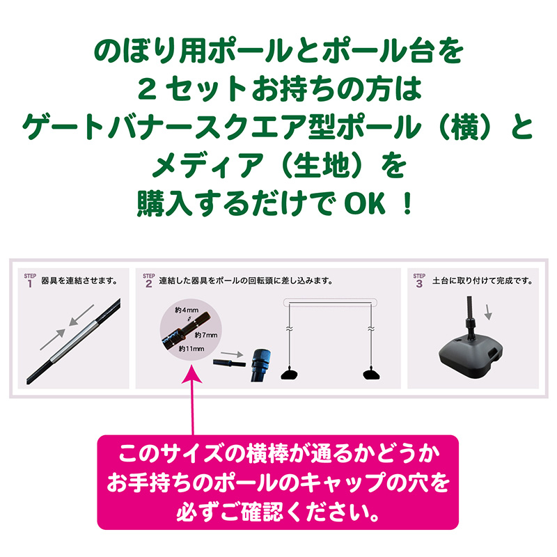 メディア(生地)、横ポール、縦ポール(2本)、ポール台(2台)で1セットとなります。 お手持ちののぼりポールをご利用の場合は、横棒を通す穴のサイズを必ずご確認ください。 ※横ポールの接続部(ポールのキャップに通す部分)の厚みは長辺約7mm×短辺約4mmです